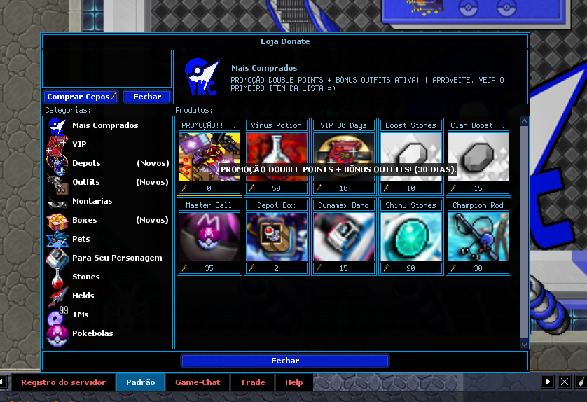 PS: Para saber se estamos com promoção, ao logar irá abrir o shop in game, clique no primeiro item do shop que custa 0 Cepos, lá explicará a promoção.